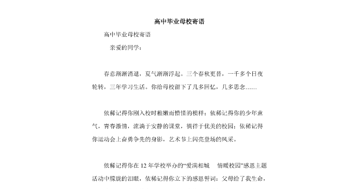 在母校的四年时光里,我见证了自己的成长与进步,也感受到了母校的伟大和包容。我将永远怀念在这里度过的美好时光,同时将秉持母校的办学理念,将所学所得用于实践,为社会的发展贡献自己的一份力量。寄语母校,是我对母校最真挚的祝福和感谢!