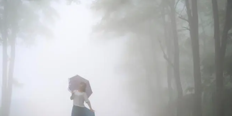 太阳正对着城镇,在阳光的照耀下,空气被转化成液态与气态的共存体。
