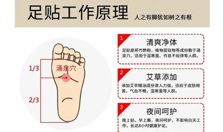 足贴是指将含有特定草药成分的贴片贴在脚底,通过足底的穴位与经络与身体相连,起到调理身体、排除湿气的作用。足贴中主要含有姜黄粉、胡椒粉、益母草、薄荷等具有排湿功能的草药成分。通过贴敷在脚底,草药成分可以迅速渗透皮肤,刺激穴位,帮助身体排毒、调理湿气。