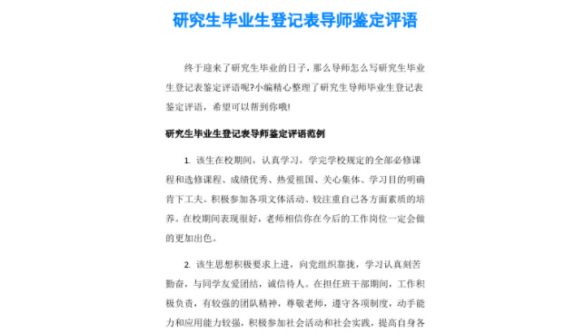 结语:毕业登记表导师评语是学生学习生涯中的一个重要环节,是对学生综合素质的一次全方位评价。导师评语不仅帮助学校和单位更好地了解学生的学术水平和综合能力,也为学生提供了一份珍贵的学业成果和人生财富。在填写毕业登记表导师评语时,导师和学生都应该真诚相待,虚心接受评价和指导,共同努力,共同成长,共同铸就美好的师生情谊。愿每一位毕业生都能在导师的关怀和指导下茁壮成长,成就辉煌的人生之路。