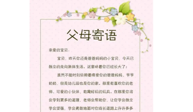 结语:亲爱的孩子,爸爸妈妈的寄语是对你最深切的关怀和期许。希望你能牢记心中,勇敢前行,健康快乐地成长。愿你能在幼儿园的每一天都收获满满的幸福和成长,我们永远爱你!
