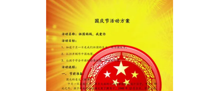 国庆节是家庭团聚的时刻,为了让家庭更加亲近,我们会举办一场亲子游园活动。在这里,家长和孩子们可以一起参加各种游戏、挑战和亲子互动活动,增进亲子之间的感情,共同度过一个愉快的假日。