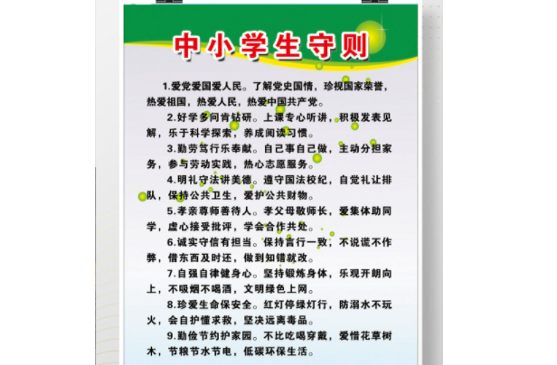 总结:国家最新的中小学生守则对学生的言行和品德提出了明确的要求,旨在引导学生树立正确的价值观和行为规范,让他们成为积极向上、健康成长的新时代少年。希望学生能够认真遵守规定,自觉引导自己的行为举止,共同营造良好的教育环境,为国家的繁荣富强和社会的和谐稳定贡献力量。