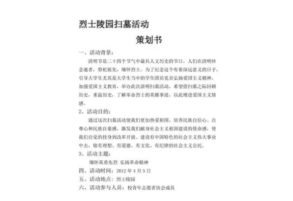 祭扫烈士陵园是中华民族传统美德之一,是对革命先烈的礼仪和悼念。为了规范和有效地组织祭扫活动,制定详细的活动方案至关重要。