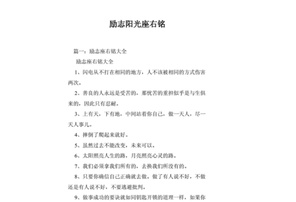 座右铭,作为一种短小精悍、饱含深意的语句,常常激励着人们在面对挑战和困难时保持积极向上的态度。它如同一盏明灯,在黑暗的时候照亮前行的方向,让人们不至迷失在困境中。在生活中,我们都需要一些积极向上的座右铭来激励自己,让自己变得更加坚强、勇敢和乐观。