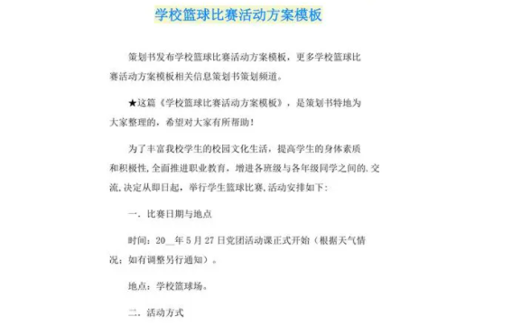 篮球赛是一项受到广泛关注的体育赛事,精彩的比赛和激烈的竞争总能吸引大批观众。为了成功举办一场篮球赛,需要精心策划和组织,以下是一个篮球赛策划案的示范。