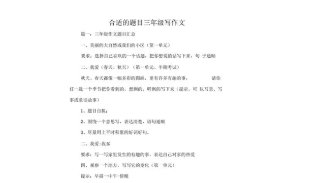 三年级是小学生学习生活中的一个重要阶段,作文是培养学生语言表达能力和思维能力的重要途径。在三年级,作文题目种类繁多,下面就以《我的家乡》、《假期生活》、《我的梦想》三个常见作文题目进行探讨。