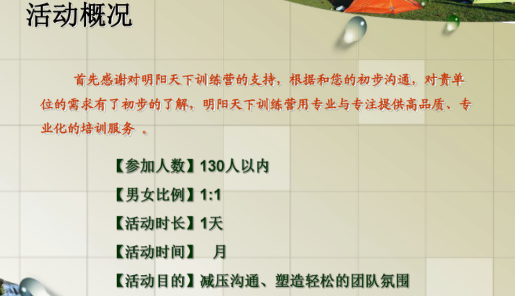 总结:拓展培训是一种非常有效的团队建设方式,能够提升团队凝聚力和领导能力。制定一个科学合理的拓展培训方案至关重要,要确保培训内容多样化,培训师团队和设备准备充分,并定期评估和调整培训方案,以达到最好的培训效果。