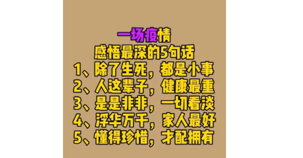4、疫情给了我们一个重新审视生活的机会。繁忙的工作让我们很少有时间停下来思考生活的意义,疫情的到来让我们有了机会重新审视我们的生活方式和目标。也许,在疫情中我们可以找到一种更简单、更幸福的生活模式。