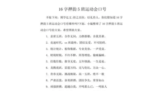16字的口号,看似简单,却包含了深厚的内涵。这种短小而有力的口号,既给人以震撼,又易于记忆,是在运动会上使用的理想口号之一。