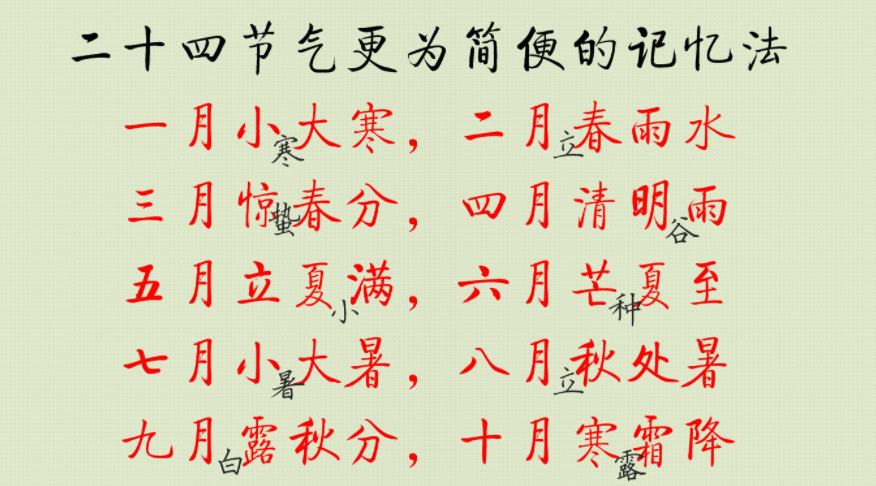 最后一段是冬季的节气,冬至是白天最短的一天,寒冷达到极点。随后“小寒”和“大寒”带来更加寒冷的气候,而这是抵挡严寒、准备迎接新春的时刻。对应的顺口溜为: