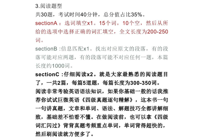 2. **阅读部分**:阅读的分数占比同样为35%。阅读理解是考试中重要的组成部分,涉及长篇和短篇的理解与分析。考生在这个环节需要具备快速抓取信息的能力,以及深度理解文章内容的技巧。在备考中,可以通过阅读不同类型的英文文章来提升阅读能力,同时培养对文章结构的敏感度。