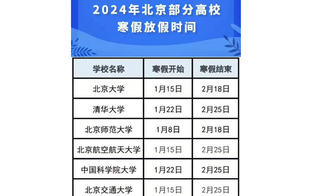 首先,我们来看一下北京大学的放假安排。北大作为中国最高学府之一,其假期时间常常是许多学校参照的标准。一般来说,北大的寒假会在春节前一个月左右开始,春节过后一个月左右再开学,具体时间会因每年春节的日期有所调整。北大非常重视学生的全面发展,因此寒假期间虽然是休假时间,但学校也会安排一些文化活动、实习机会或是冬季运动会等,以丰富学生的生活。暑假则相对固定,从7月初开始到8月底结束,期间有短期课程、社会实践和国际交流项目等,为学生提供多样化的学习机会。