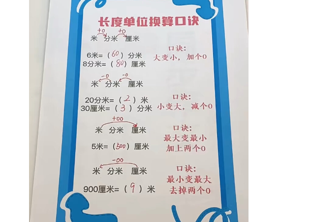 当然,仅仅依靠口诀是远远不够的。有效的学习必须结合练习与实际应用。在课堂上,老师们可以设计一些基于这些口诀的游戏和活动,如“单位换算竞赛”,或者让学生用不同长度的物体进行测量和记录,这样可以让理论与实践相结合,深化学生的理解。
