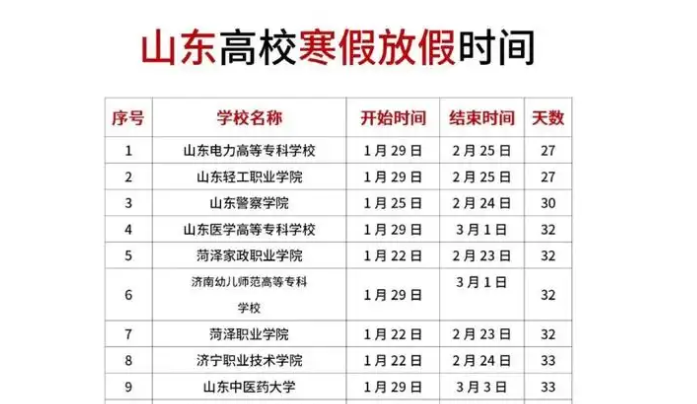 - **寒假**:寒假可能略短于综合性大学,但依然会考虑到学生返乡和节日气氛,一般从元旦后开始,到春节期间结束。