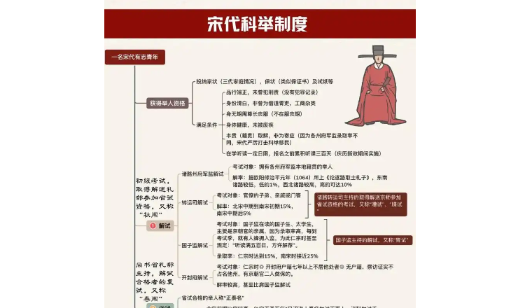 1. **乡试**:每三年一次,一般在秋天举行,所以也被称为“秋试”。通过乡试的生员即被称为“举人”,这是获得仕途的关键一步。乡试不仅是学术水平的竞争,也包含了家庭背景、社会关系等多方面的影响。