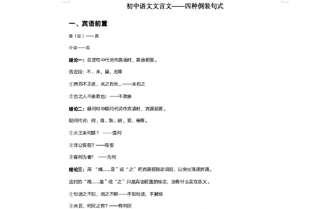2. **宾语前置**:“宋何罪之有哉?”(《论语·公治长》)在这里,“何罪之有”相当于“有何罪”,将宾语提前。