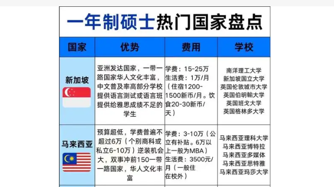 在选择攻读硕士学位的国家时,需要综合考虑学费、生活费以及教育质量等因素,以确保能够获得最好的学术体验。希望以上信息能够帮助您找到最适合您的一年制硕士学位的国家。
