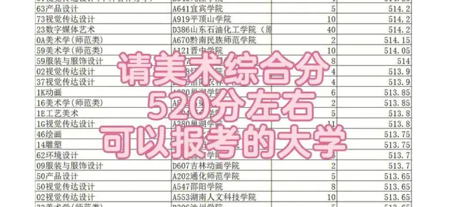 对于美术生来说,艺术类院校是最理想的选择之一。这些院校注重学生的艺术天赋和创造力,而综合分500在一些专业较为热门的院校中是可以考虑的分数线。例如,某些艺术设计类专业可能对综合分数并不是特别苛刻,因此美术生可以考虑报考这类院校。