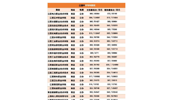江西省拥有众多优质的公办专科学校,这些学校在教学质量、师资力量和学术声誉等方面都备受认可。本文将介绍江西公办专科学校的排名情况,帮助学生和家长更好地了解江西省内各专科学校的优劣势,为选择合适的学校提供参考。