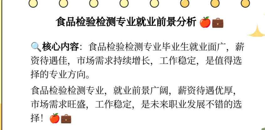 综上所述,食品检验检测技术的就业前景十分广阔,市场需求持续增长,就业机会多元化,技术更新换代,薪酬待遇较好。对于有志于从事食品安全领域的人来说,掌握食品检验检测技术将会为他们的职业发展打开更广阔的空间。