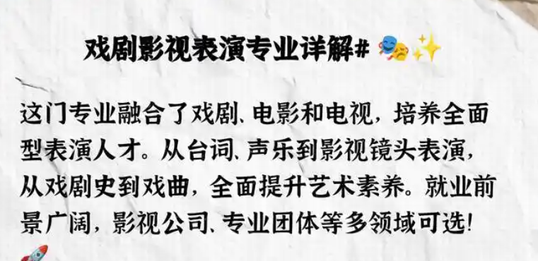 当谈到戏剧影视表演专业时,我们不仅仅是在谈论一门学科,更是在探讨一种艺术的传承与创新。戏剧影视表演专业是一个融合了表演艺术、文学、音乐、舞蹈等多种艺术形式的综合性学科,培养学生的表演技巧、创造力和批判性思维。下面将从不同角度来探讨戏剧影视表演专业的重要性和特点。