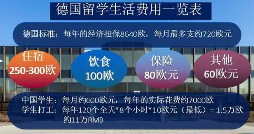 留学期间,生活费是不可忽视的一部分。德国的生活成本因城市而异,一线城市如慕尼黑、法兰克福的生活费用相对较高,而莱比锡、波恩等城市则较为经济。通常情况下,学生每月的生活费用(包括住宿、饮食、交通、医疗保险和娱乐活动等)在600至1000欧元之间,折合人民币大约在5万至8万人民币/年。以下是生活费用的具体项目: