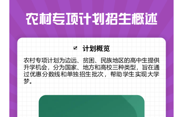 农村专项计划是国家针对农村地区学生实施的一项特殊招生政策,主要面向来自经济较为落后和教育资源相对匮乏的县域及乡镇的优秀高中毕业生。这一政策的推出,是为了促进教育公平,缩小城乡教育差距,帮助农村学生顺利进入高等院校,改变其命运。