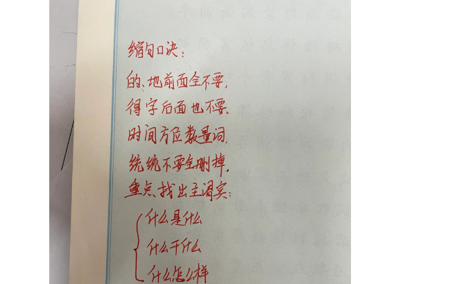 这句话提醒我们,在缩句时要找出句子的主干,识别出主语、谓语和宾语。例如,“这本书是我去年买的。”可以缩为“我买的书。”