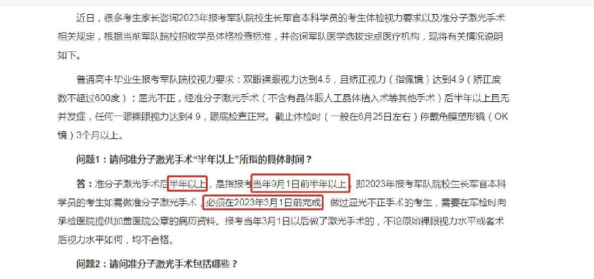 结论:对于预备报考军校的学生来说,做近视手术的最佳时机是在高三下学期或者大学一年级。