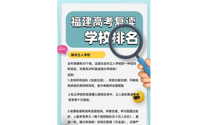 泉州四中是泉州地区知名的高中,近几年的升学率始终保持在一个较高的水平。该校的复读班以“科学、严谨、有效”著称。学校注重为学生制定合理的学习计划,每个学生都会有专属的学习方案,由经验丰富的老师进行跟踪指导,确保每一位复读生都能在自己的知识薄弱环节上有所突破。